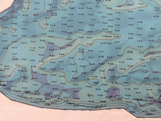 A helykeresést egy radarral felszerelt etetőhajóval végeztem. Előttünk változatos mederviszonyaival tárult fel a tó: 2,5 és 8,5 méter közötti mélységek váltották egymást, mindenhol haltartó helyekkel.