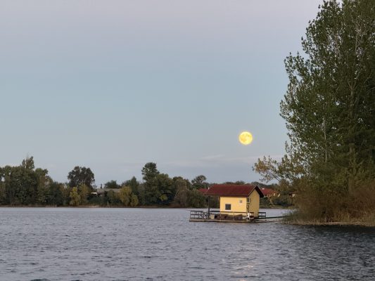 Már az érkezés is igazi élmény volt – csónakkal kellett beköltözni a vízen úszó kis házba. Kiskutyám, Bukfenc, azonnal birtokba vette a házat és a stéget, szemmel láthatóan egyáltalán nem zavarta, hogy vízen vagyunk, és mindössze 25-30 négyzetméternyi mozgástere van.