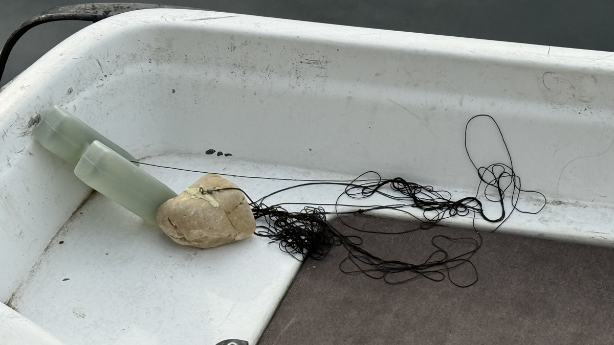 Szerda délelőtt újragondoltam mindent: fluorocarbon előkét kötöttem, F1Thulair 4-es horoggal. Ekkor érkezett Géza, az egyik tógazda, aki javasolta, hogy próbáljam inkább a wakeboard pálya medrét, ott, ahol a sekély letörik a mélybe.