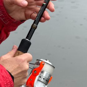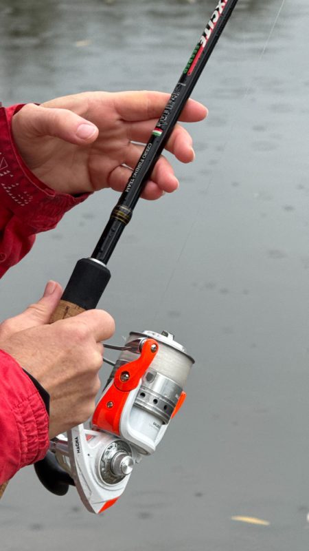 Amíg én 5–6 perces ütemben dobtam, Kata kényelmesen, félóránként frissítette a szerelékét. Közben az eső is elkezdett lassan csepegni… és az első dobására Kata halat fogott!