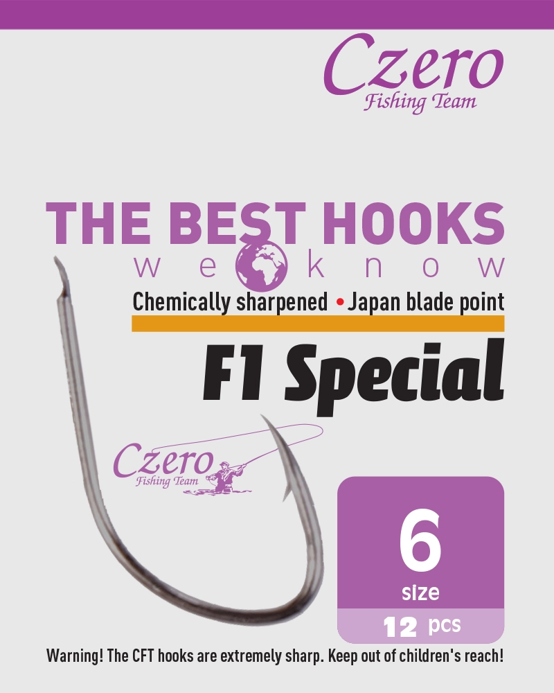 A Czero F1 Special horog egy igazi mindenes, amelyet úgy terveztek, hogy bármilyen horgászmódszernél megállja a helyét. Kiegyensúlyozott kialakítása és éles horoghegy garantálja a biztos akasztást minden kapásnál. Könnyű, mégis kellően erős. Formájából adódóan, alkalmas, élő csalis, kukorica vagy búza csali felkínálására is.